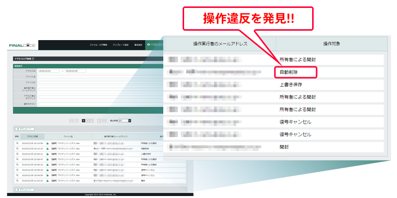 不正に持ち出されたマイナンバーリストも、あとからアクセス制限を変更したり、ファイルそのものを消去したりすることができるため、確実に情報漏洩を防止します。